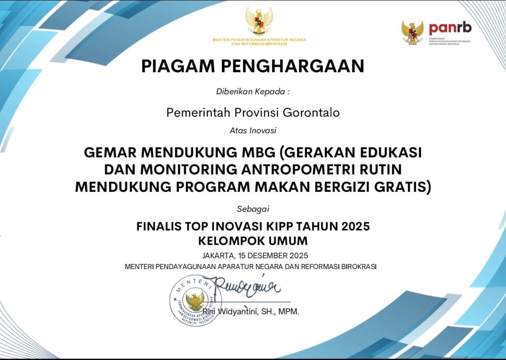 Kepala Dinas Kesehatan, Pengendalian Penduduk dan Keluarga Berencana (Dinkes P2KB) Provinsi Gorontalo, Anang S. Otoluwa, dalam keterangannya pada Senin (12/01/2026), mengungkapkan bahwa dua inovasi Gorontalo berhasil masuk sebagai Finalis Top Inovasi Pelayanan Publik KIPP 2025.
