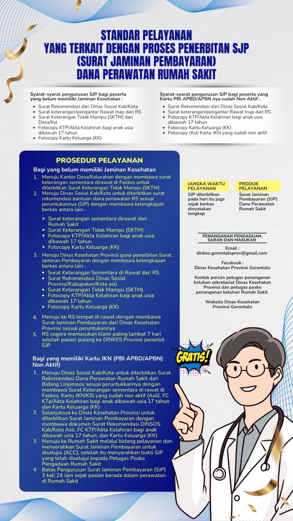 Standar Pelayanan Yang Terkait Dengan Proses Penerbitan SJP (Surat Jaminan Pembayaran) Dana Perawatan Rumah Sakit Sosial Media Dinas Kesehatan Provinsi Gorontalo : Channel YoutubeFacebook PageFacebookTwitterInstagram Post Views: 382